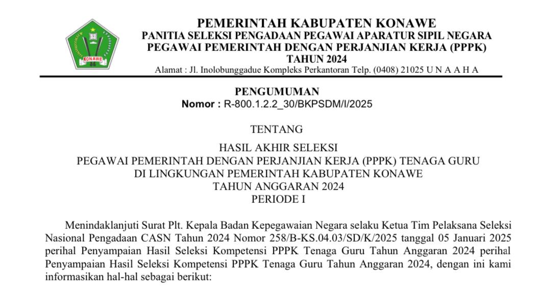 Tajukperistiwa.com, Konawe II Pemerintah Daerah (Pemda) Konawe melalui Panitia Seleksi Pengadaan Pegawai Pemerintah dengan Perjanjian Kerja (PPPK) resmi mengumumkan hasil seleksi administrasi PPPK lingkup Pemda Konawe untuk tahap II tahun anggaran 2024, selasa (18/2/25)