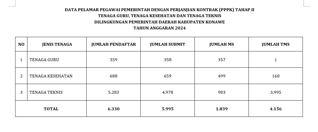 Berdasarkan data pelamar Pegawai Pemerintah dengan Perjanjian Kerja tahap dua baik tenaga guru, tenaga kesehatan maupun tenaga tekhnis yang dihimpun awak media ini adalah sebagai berikut :