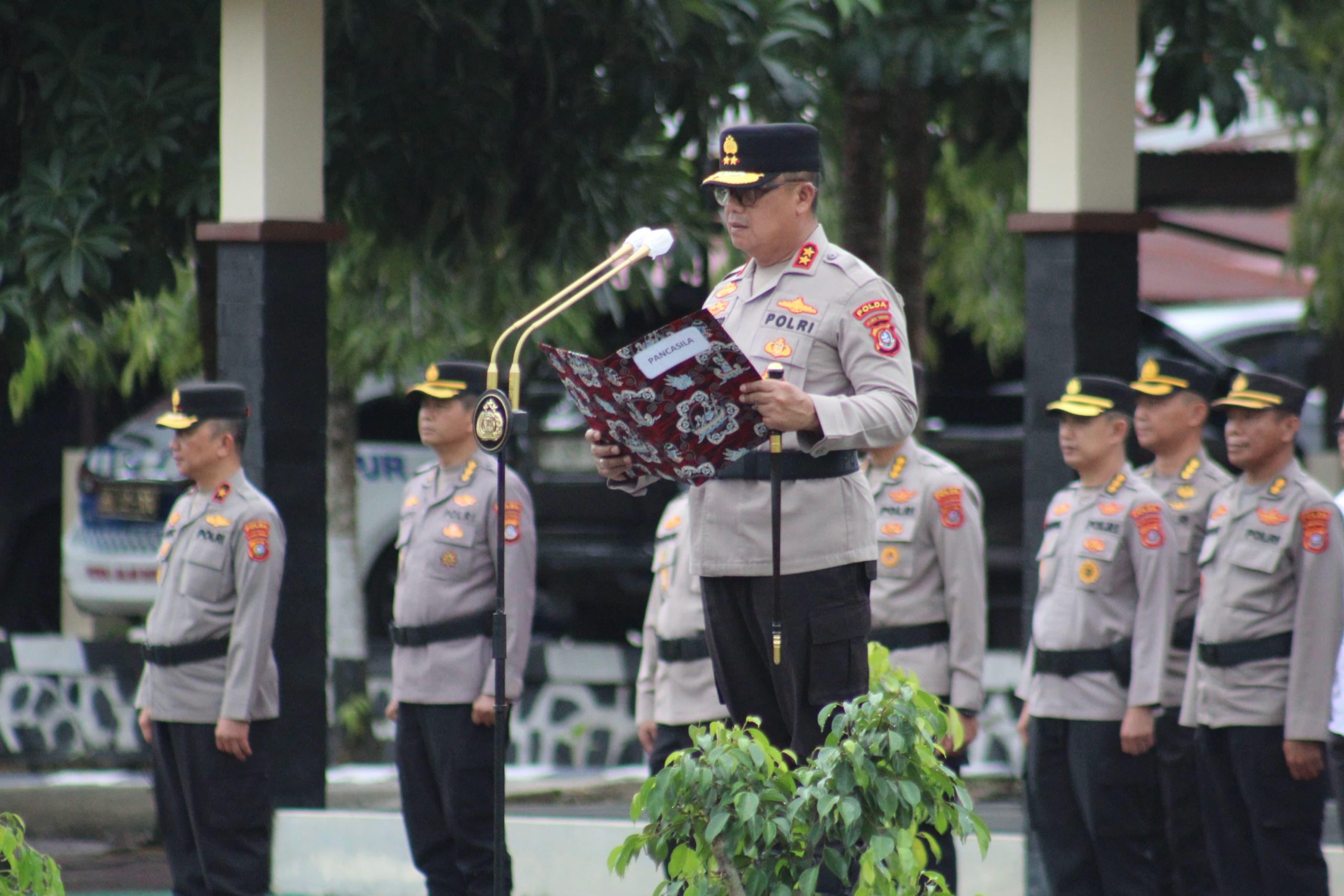 Tajukperistiwa.com, Kendari || Kepala Kepolisian Daerah Sulawesi Tenggara (Kapolda Sultra) Irjen Pol Dwi Irianto, S.IK., M.Si memimpin langsung pelaksanaan upacara bulanan Hari Kesadaran Nasional yang digelar di Lapangan Apel Mapolda Sultra, Kamis, (17/4/25)