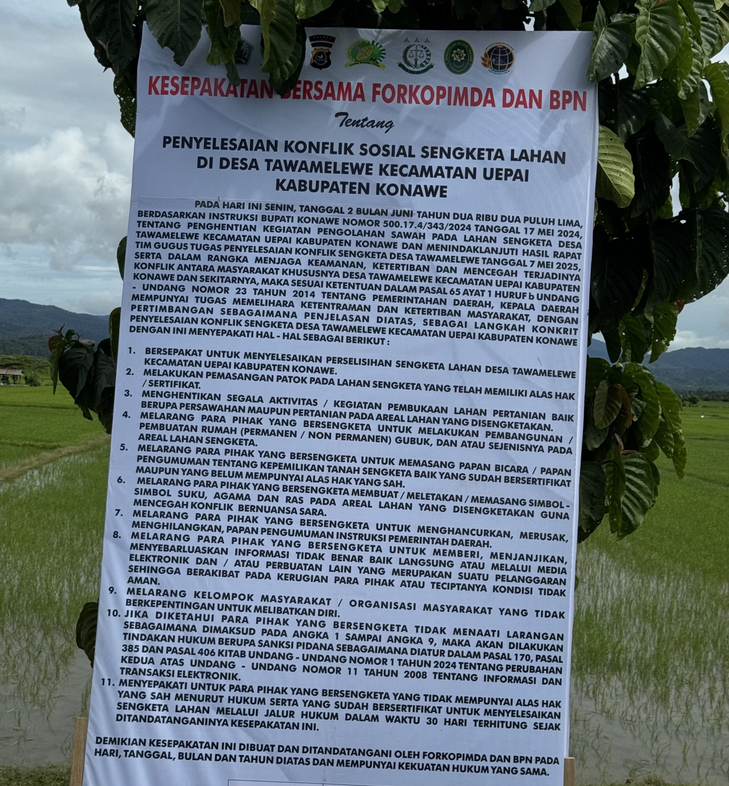 Hal ini setelah Pemerintah Daerah (Pemda) Konawe, melalui Wakil Bupati Konawe, bersama Forum Koordinasi Pimpinan Daerah (Forkopimda), BPN Konawe, Sekda Konawe, sejumlah anggota DPRD Konawe, DPD LAT Konawe, Camat, Kepala Desa turun langsung ke lokasi lahan sengketa tersebut