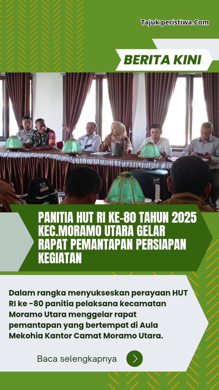 Tajukperistiwa.ComKonawe Selatan || Dalam rangka menyukseskan perayaan Hari Ulang Tahun Republik Indonesia ke-80, Panitia Pelaksana Kecamatan Moramo Utara menggelar rapat pemantapan yang bertempat di Aula Mekohia Kantor Camat Moramo Utara, Selasa (29/07/25).