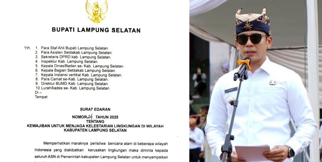 Tajukperistiwa.com, Lampung Selatan || Bupati Lampung Selatan, Radityo Egi Pratama, resmi mengeluarkan Surat Edaran Nomor 24 Tahun 2025 tentang Kewajiban Menjaga Kelestarian Lingkungan Hidup di wilayah Kabupaten Lampung Selatan.