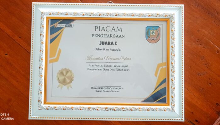 Tajukperistiwa.Com-Konawe Selatan  || Camat Moramo Utara Joni.S.Pd.M.Si menerima Reward atas Prestasi dalam Tindak Lanjut Pengelolaan Dana Desa Tahun 2024, Senin (19/1/26).