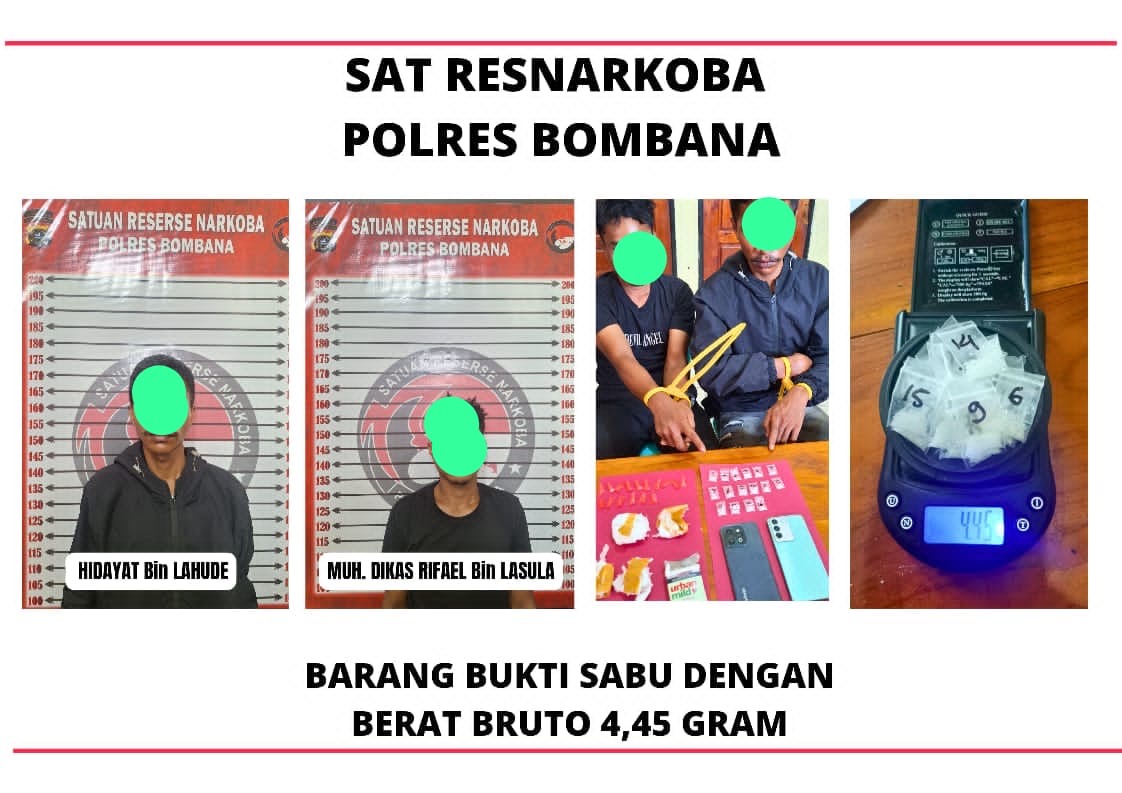Dalam operasi yang digelar pada hari ini pukul 13.40 WITA, Satres Narkoba Polres Bombana dibawah komando Kasat Narkoba AKP Muh. Arman, SH., MH mengamankan dua pria berinisial HT (21) dan MDR (24) yang diduga melakukan Tindak Pidana Narkotika Golongan I jenis Sabu