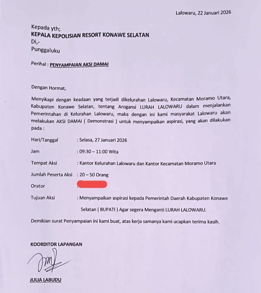 Rencana aksi damai itu tertuang dalam surat pemberitahuan yang ditujukan kepada Kepala Kepolisian Resor Konawe Selatan dan tertanggal 22 Januari 2026.