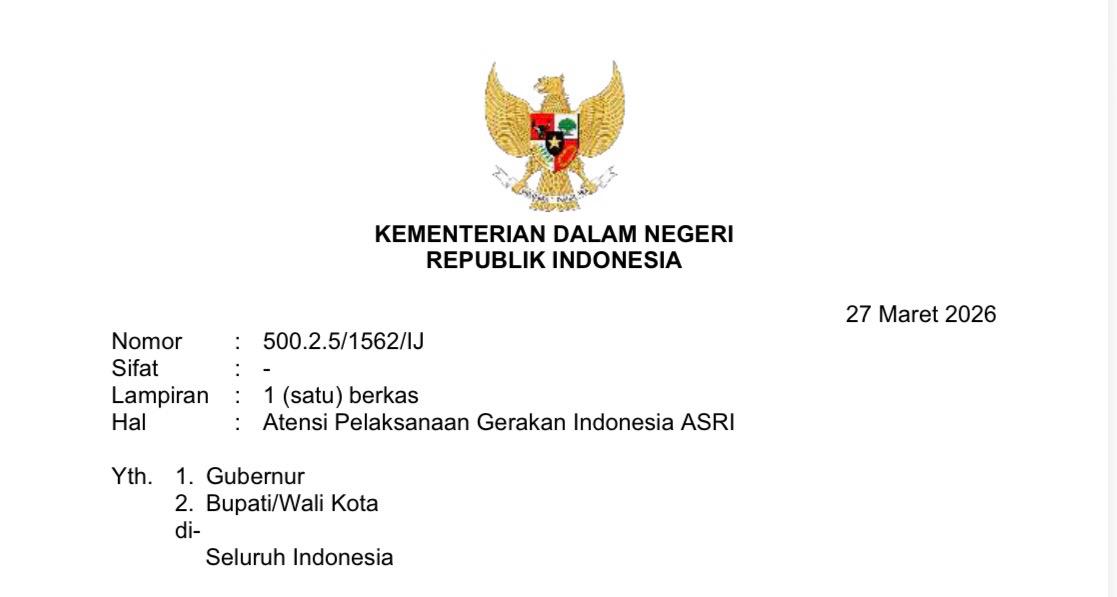 Apresiasi ini diberikan melalui surat Kemendagri RI nomor 500.2.5/1562/IJ tertanggal 27 Maret 2026, yang di tujukan kepada Gubernur, Bupati dan walikota di seluruh Indonesia tentang Atensi Pelaksanaan Gerakan Indonesia ASRI di wilayah masing-masing