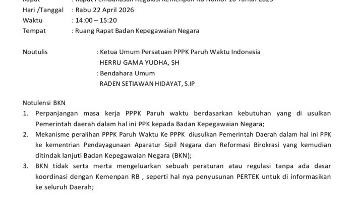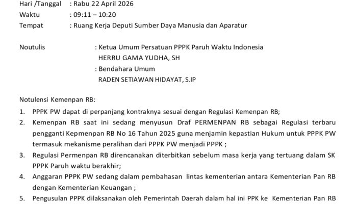 Sementara itu Ketua Umum Persatuan PPPK Paruh Waktu Indonesia Herru Gama Yudha menyampaikan kabar menggembirakan terkait hasil audiensi mereka dengan pejabat KemenPANRB dan BKN pada Rabu (22/4).
